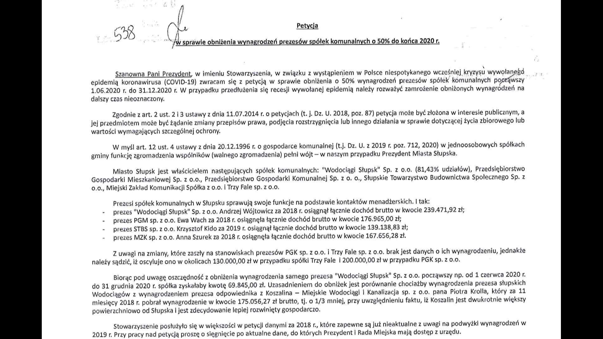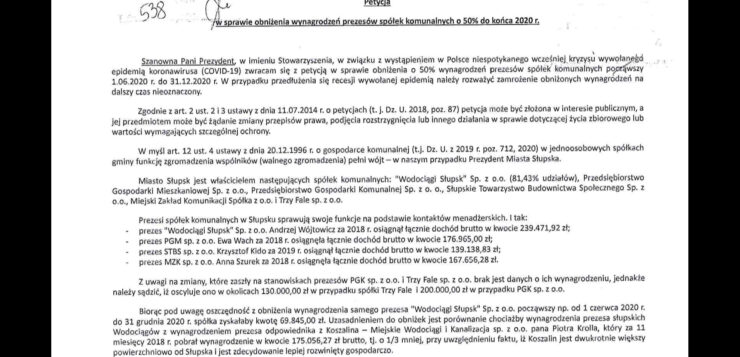Do Urzędu Miejskiego w Słupsku wpłynęła petycja w sprawie obniżenia wynagrodzeń szefom słupskich spółek komunalnych. Autorzy pisma wnioskują, aby pensje prezesów zarządu były zredukowane o 50 procent.