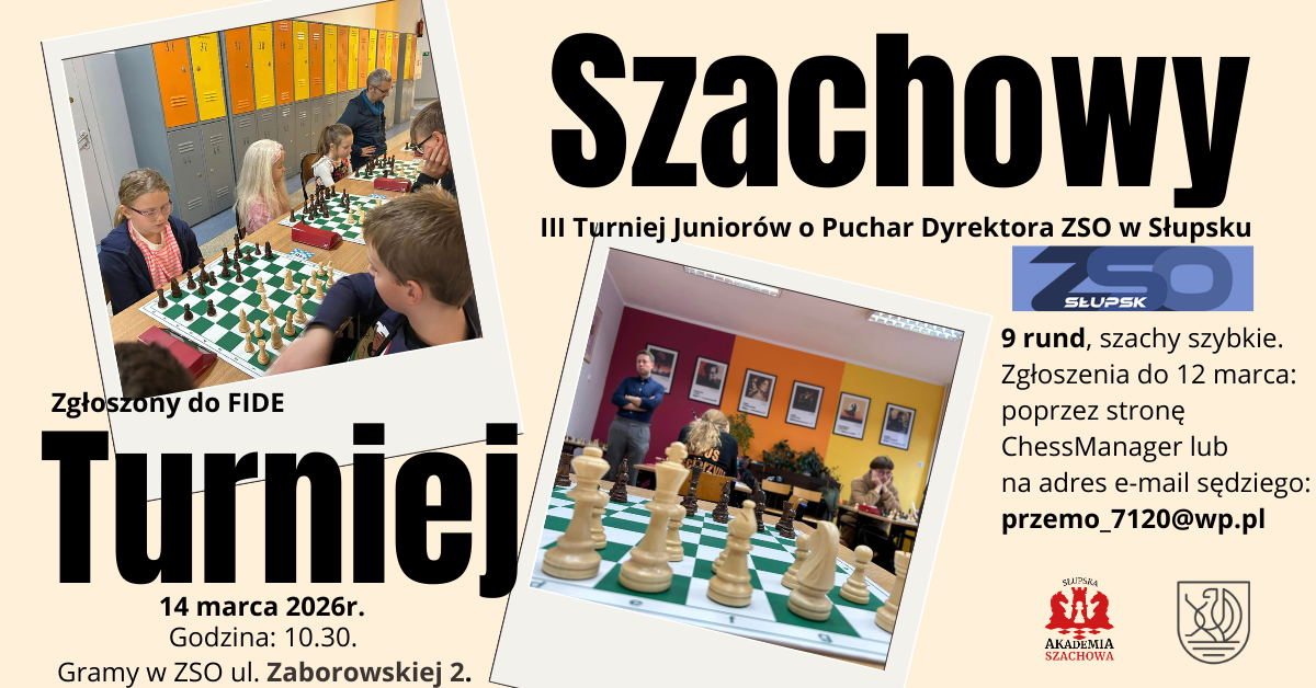 – Przed nami turniej w IV Liceum Ogólnokształcącym im K.K. Baczyńskiego w Słupsku, Szkole Podstawowej nr 16 z Oddziałami Sportowymi w Słupsku, czyli ZSO – informują organizatorzy. – To już trzecia edycja zawodów o Puchar Jolanty Banaszkiewicz, dyrektor ZSO w Słupsku. Dzięki Przemysławowi Owczarkowi zawody będą poddane ocenie rankingowej FIDE. Wpisowe wynosi 50 zł.
