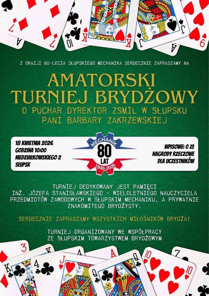 Amatorski Turniej Brydżowy o Puchar Dyrektor Zespołu Szkół Mechanicznych i Logistycznych w Słupsku odbędzie się 18 kwietnia 2026 roku o godzinie 10.00 w budynku szkoły przy ulicy Mieczysława Niedziałkowskiego 2. Impreza dedykowana jest pamięci inż. Józefa Stanisławskiego, wieloletniego nauczyciela przedmiotów zawodowych w słupskim Mechaniku, znakomitego brydżysty. Wydarzenie współorganizuje Słupskie Towarzystwo Brydżowe. (jwb)